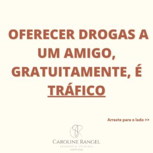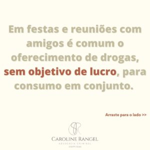 Em festas e reuniões com amigos é comum o oferecimento de drogas, sem objetivo de lucro, para consumo em conjunto.O que muitas pessoas não sabem é que isso é caracterizado, pela lei penal, como tráfico de drogas.A pena é de detenção de 06 meses a 01 ano, além de multa.